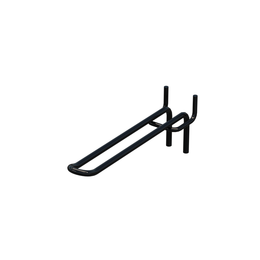 Торговые крючки для перфорации длиной 150 мм предназначены для надежного размещения товаров на перфорированных стендах. Изделие выполнено из металлического прута диаметром 5 мм. Покрытие цвета Черный RAL9005 защищает конструкцию от повреждений и коррозии. Шаг крепления составляет 45 мм. Тип исполнения — Двойной. Способ крепления — На перфорацию.