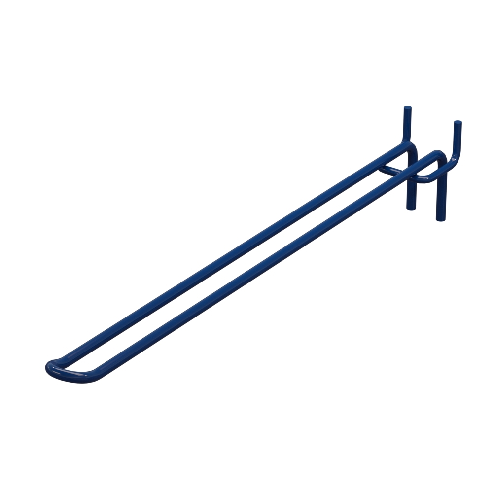 Торговые двойные крючки для выкладки товаров длиной 300 мм подходят для оформления торгового пространства с использованием перфопанелей. Изделие выполнено из металлического прута диаметром 5 мм. Покрытие цвета Синий RAL5002 защищает конструкцию от повреждений и коррозии. Шаг крепления составляет 30 мм. Тип исполнения — Двойной. Способ крепления — На перфорацию.