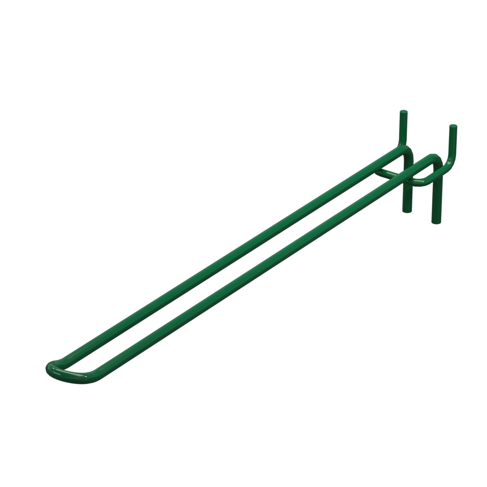 Двойные крючки для перфорированного стеллажа длиной 300 мм обеспечивают аккуратную выкладку продукции в торговых помещениях. Изделие выполнено из металлического прута диаметром 5 мм. Покрытие цвета Зеленый RAL6029 защищает конструкцию от повреждений и коррозии. Шаг крепления составляет 30 мм. Тип исполнения — Двойной. Способ крепления — На перфорацию.
