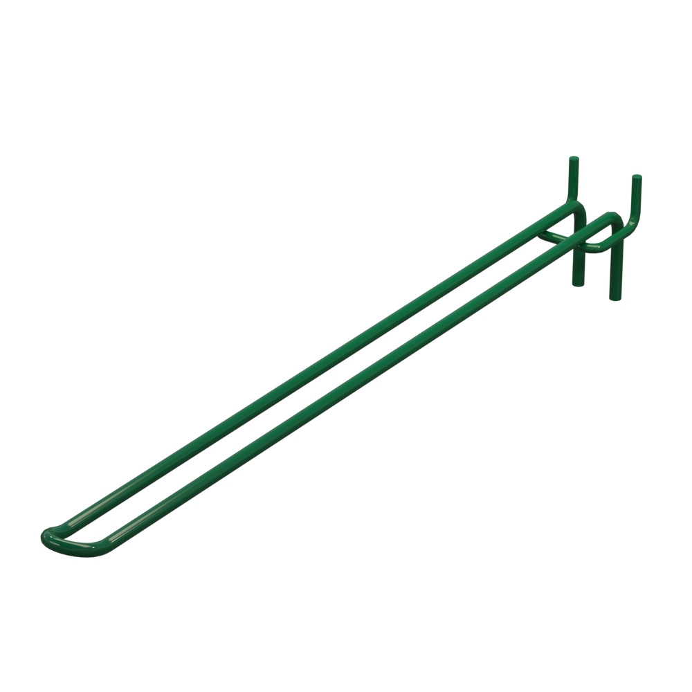 Крючок двойной на перфорацию для магазина длиной 350 мм обеспечивают аккуратную выкладку продукции в торговых помещениях. Конструкция изготовлена из стали с толщиной прута 5 мм. Покрытие выполнено в цвете Зеленый RAL6029. Шаг перфорации — 40 мм. Тип крючка — Двойной. Способ установки — На перфорацию.