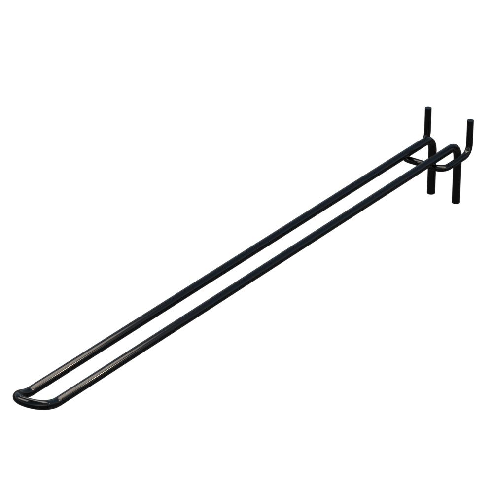 Торговые двойные крючки для выкладки товаров длиной 400 мм обеспечивают аккуратную выкладку продукции в торговых помещениях. Изделие выполнено из металлического прута диаметром 5 мм. Покрытие цвета Черный RAL9005 защищает конструкцию от повреждений и коррозии. Шаг крепления составляет 30 мм. Тип исполнения — Двойной. Способ крепления — На перфорацию.