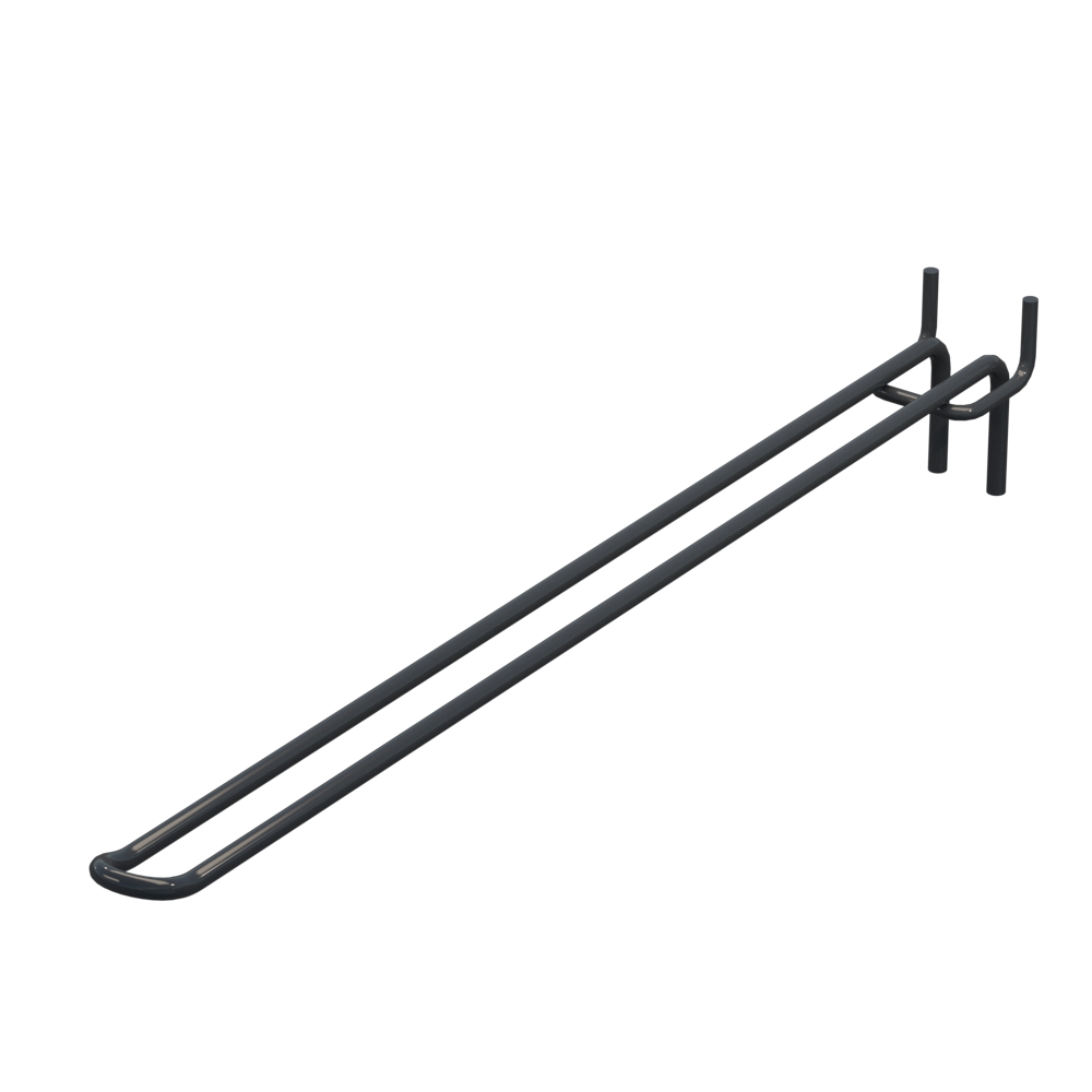 Торговые крючки для перфорации длиной 350 мм обеспечивают аккуратную выкладку продукции в торговых помещениях. Изделие выполнено из металлического прута диаметром 5 мм. Покрытие цвета Антрацит RAL7024 защищает конструкцию от повреждений и коррозии. Шаг крепления составляет 50 мм. Тип исполнения — Двойной. Способ крепления — На перфорацию.