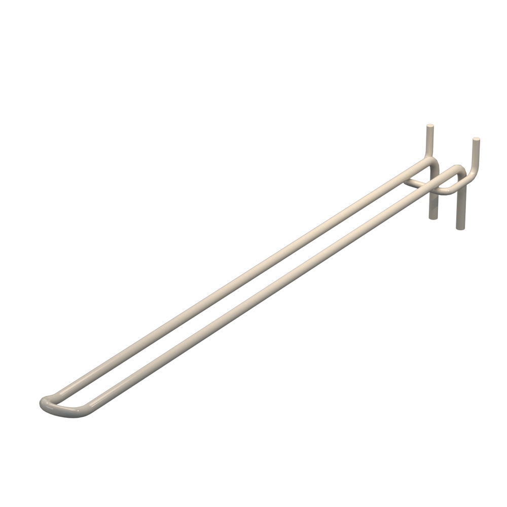 Торговые крючки для перфорации длиной 350 мм подходят для оформления торгового пространства с использованием перфопанелей. Изделие выполнено из металлического прута диаметром 5 мм. Покрытие цвета Бежевый RAL9001 защищает конструкцию от повреждений и коррозии. Шаг крепления составляет 40 мм. Тип исполнения — Двойной. Способ крепления — На перфорацию.