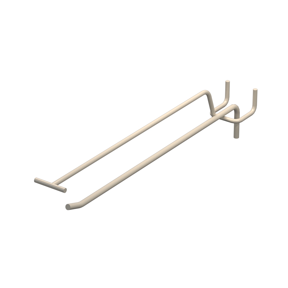Крючки с ценникодержателем одинарные длиной 250 мм обеспечивают удобное размещение товаров на перфорированных панелях. Изделие изготовлено из стали с прутом диаметром 5 мм. Поверхность окрашена в цвет Бежевый RAL9001. Шаг перфорации — 35 мм. Тип конструкции — Одинарный с ценникодержателем. Способ монтажа — На перфорацию.