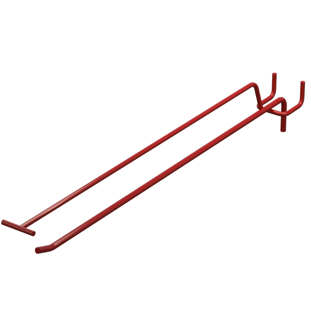 Купить одинарные крючки для перфорации с ценникодержателем длиной 350 мм предназначены для размещения продукции на торговых стендах с перфорацией. Изделие изготовлено из стали с прутом диаметром 5 мм. Поверхность окрашена в цвет Красный RAL3020. Шаг перфорации — 50 мм. Тип конструкции — Одинарный с ценникодержателем. Способ монтажа — На перфорацию.