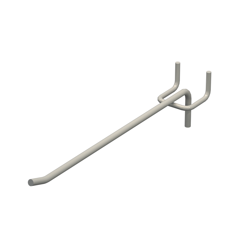 Крючок для магазина длиной 200 мм изготовлен из металлического прута диаметром 4 мм. Прут диаметром 4 мм обеспечивает прочность и надежность. Длина изделия — 200 мм. Покрытие — Светло серый RAL7035. Крючок предназначен для крепления на перфорации с шагом 50 мм. Тип — Одинарный. Способ крепления — На перфорацию.