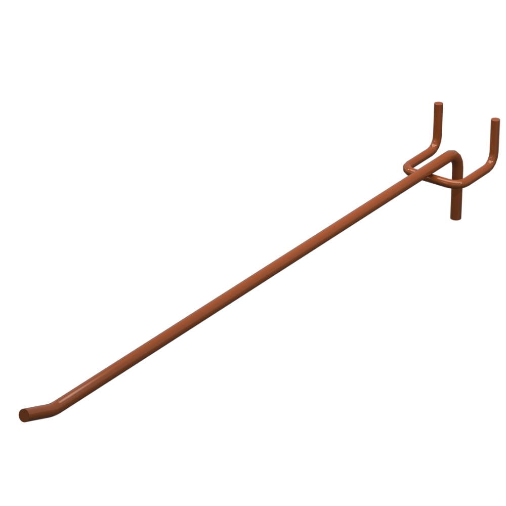 Одинарный торговый крючок с длиной 300 мм применяется для выкладки продукции на перфорированных панелях. Изделие выполнено из металла с прутом диаметром 5 мм. Покрытие цвета Коричневый RAL8023 обеспечивает защиту от коррозии. Шаг крепления — 50 мм. Тип исполнения — Одинарный. Крепление — На перфорацию.