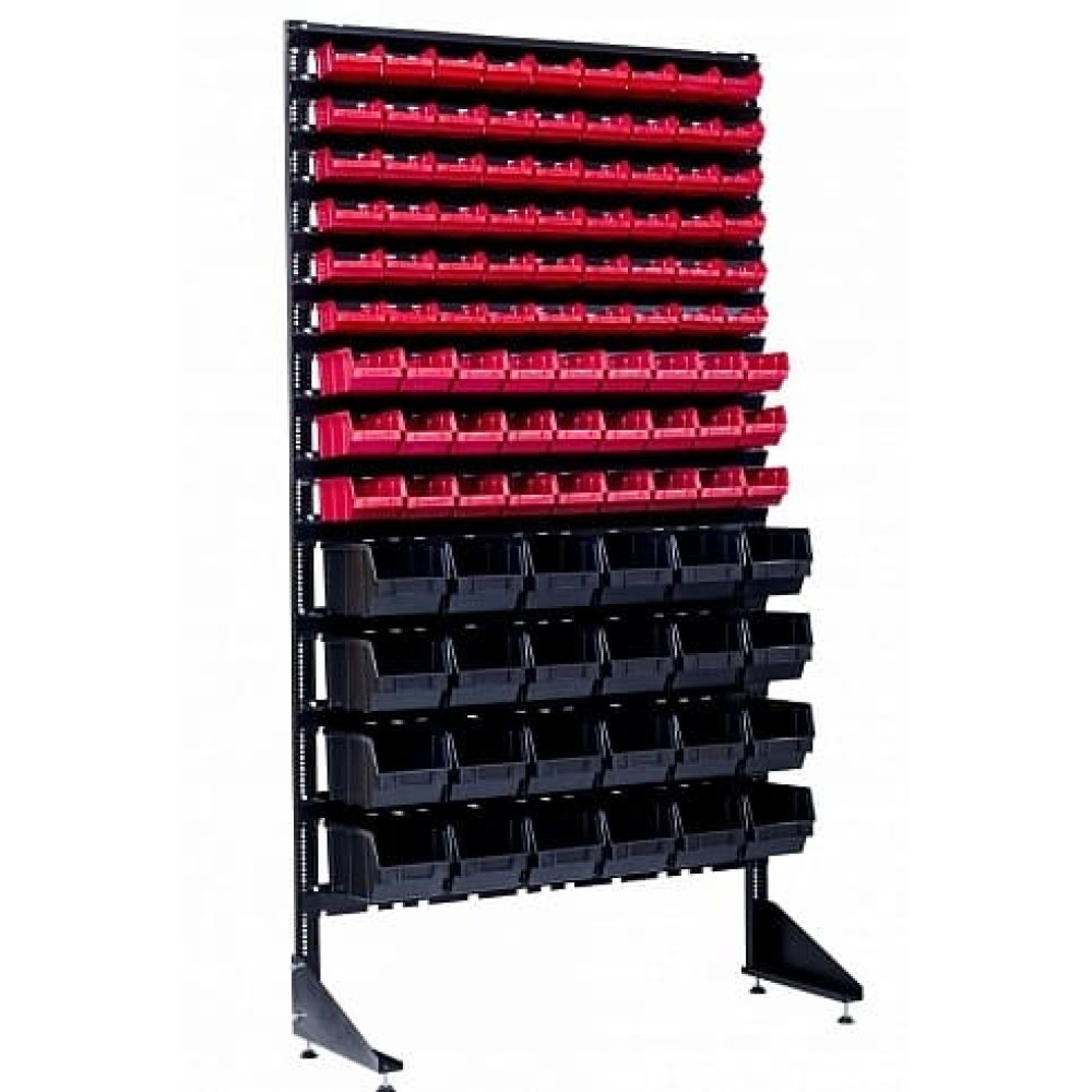 Эффективная организация рабочего пространства на стеллаже одностороннем 1800 мм - 105 кювет основана на принципах ABC-анализа и эргономики. Нижняя зона (400–900 мм): 54 ящика 703 LUX красный (100×100×50 мм, 0,5 л, 1,6 кг) — самые ходовые позиции: саморезы 3–5 мм, дюбели, шайбы, гроверы, мелкие гайки. Средняя зона (700–1300 мм): 27 ящиков 702 LUX красный (165×100×75 мм, 1,24 л, 3 кг) — среднеходовые: саморезы 5–7 мм, винты, средние болты. Верхняя зона (1300–1800 мм): 24 ящика 701 LUX черный (230×150×120 мм, 4,14 л, 7 кг) — редко используемые: крупные болты М10+, анкеры, длинные саморезы.