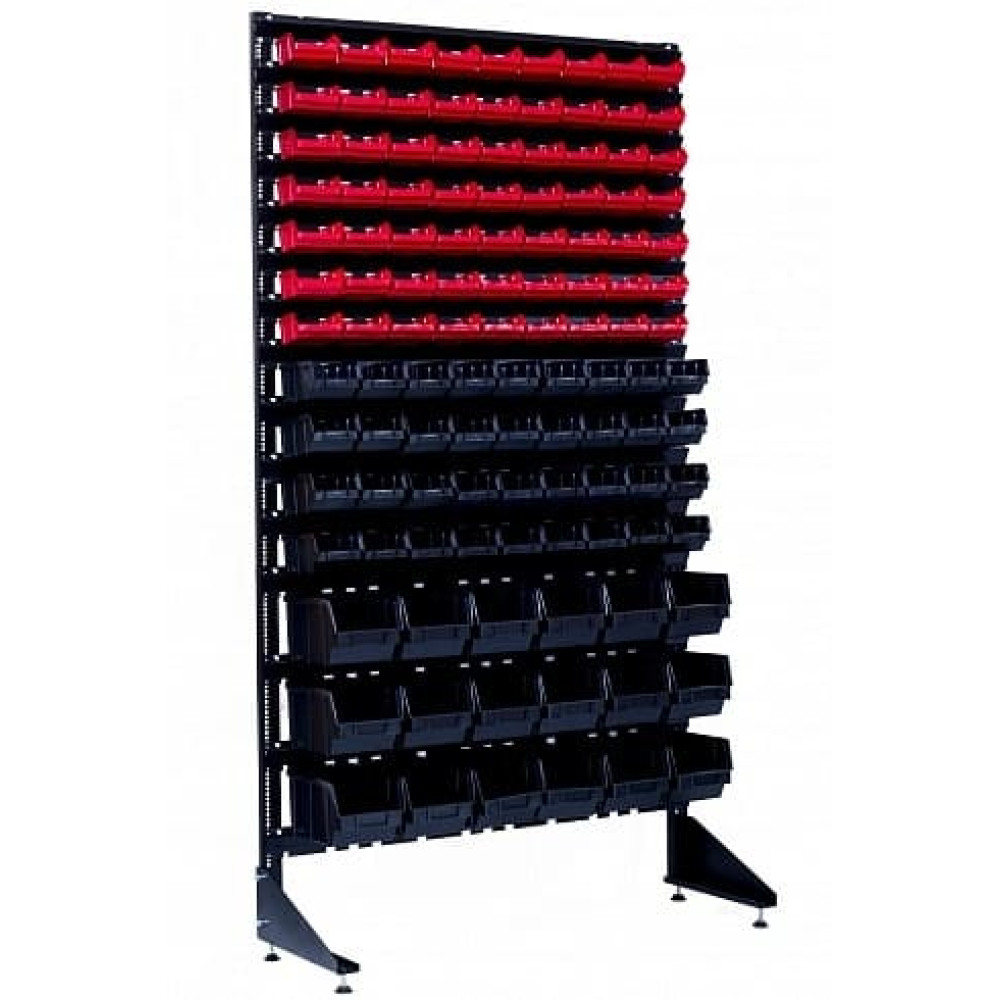 Комплектация тщательно выверена под реальный ассортимент магазинов и СТО: 18 больших ящиков 701 чёрных (230×150×120 мм) — для анкеров, такелажа, длинных болтов; 36 средних 702 чёрных (165×100×75 мм) — для саморезов, дюбелей, гаек, шайб; 63 малых 703 красных (100×100×50 мм) — для дорогого крепежа и мелочевки. Такая расстановка позволяет разместить до 35 000+ позиций на одном стенде. При необходимости мы бесплатно перекомплектуем любой стенд под ваш ассортимент — заменим часть красных ящиков на синие, зелёные или жёлтые.