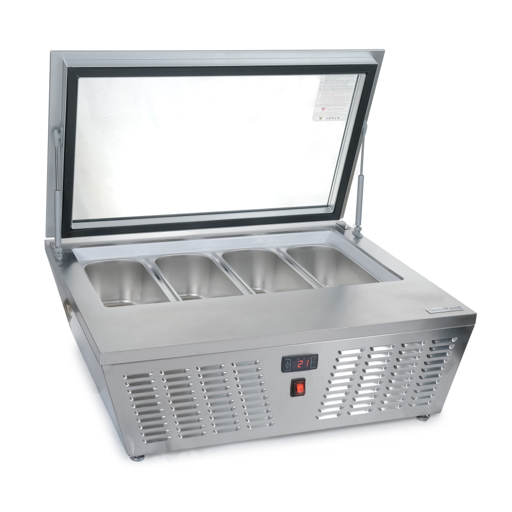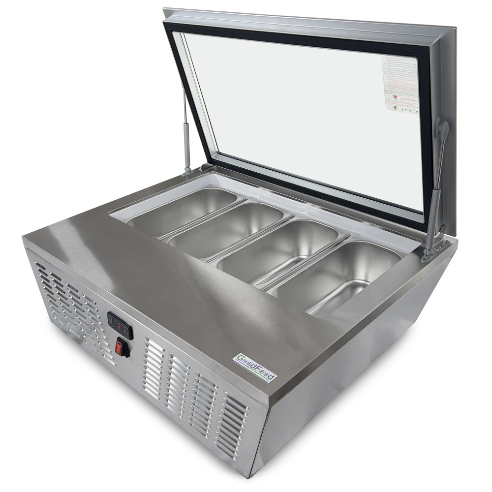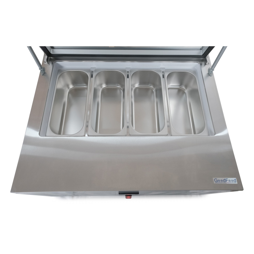 - В комплекте 4 шт. гастроемкости GN 1/3х150 без крышек для хранения мороженого.