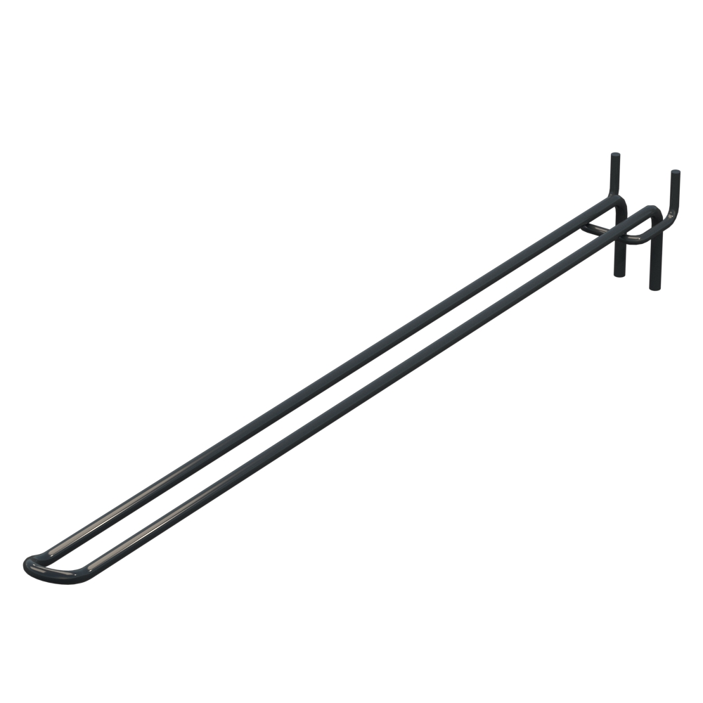 Двойные крючки для перфорации длиной 400 мм подходят для оформления торгового пространства с использованием перфопанелей. Изделие выполнено из металлического прута диаметром 5 мм. Покрытие цвета Графитовый RAL7016 защищает конструкцию от повреждений и коррозии. Шаг крепления составляет 50 мм. Тип исполнения — Двойной. Способ крепления — На перфорацию.