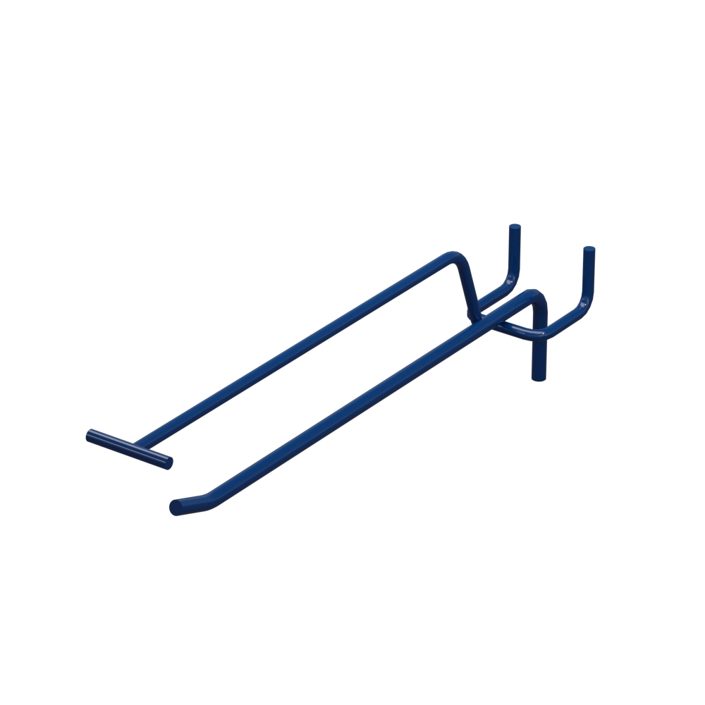 Крючок одинарный с ценникодержателем для перфорации длиной 200 мм применяются для выкладки продукции в магазинах и торговых точках. Изделие изготовлено из стали с прутом диаметром 5 мм. Поверхность окрашена в цвет Синий RAL5002. Шаг перфорации — 25 мм. Тип конструкции — Одинарный с ценникодержателем. Способ монтажа — На перфорацию.