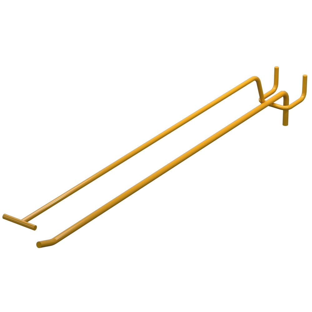 Одинарные торговые крючки с ценникодержателем на перфорацию длиной 350 мм применяются для выкладки продукции в магазинах и торговых точках. Изделие изготовлено из стали с прутом диаметром 5 мм. Поверхность окрашена в цвет Желтый RAL1023. Шаг перфорации — 30 мм. Тип конструкции — Одинарный с ценникодержателем. Способ монтажа — На перфорацию.