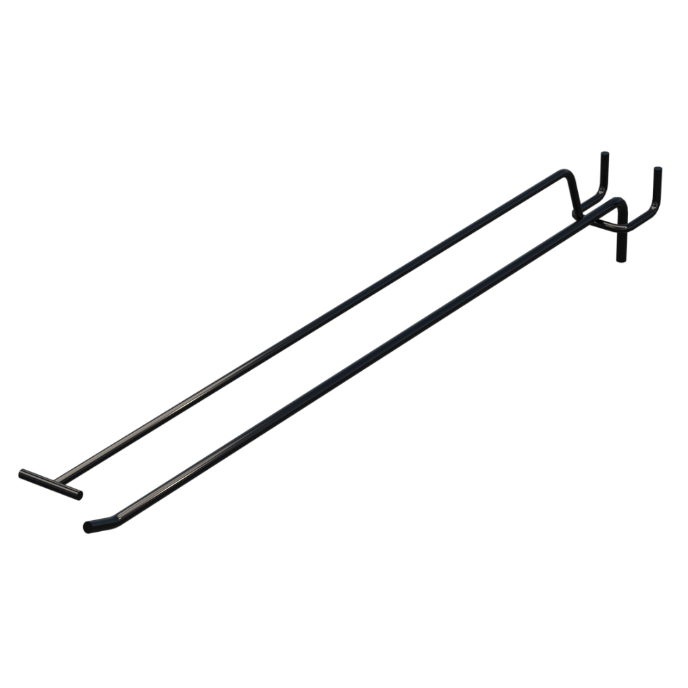 Одинарные торговые крючки с ценникодержателем на перфорацию длиной 400 мм применяются для выкладки продукции в магазинах и торговых точках. Конструкция выполнена из металлического прута диаметром 5 мм. Покрытие цвета Черный RAL9005 обеспечивает защиту от коррозии. Шаг крепления составляет 35 мм. Тип исполнения — Одинарный с ценникодержателем. Способ крепления — На перфорацию.