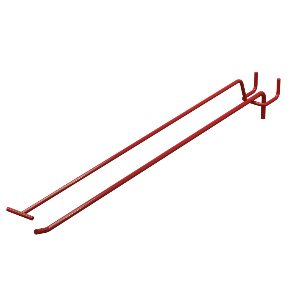 Одинарные торговые крючки с ценникодержателем на перфорацию длиной 400 мм применяются для выкладки продукции в магазинах и торговых точках. Изделие изготовлено из стали с прутом диаметром 5 мм. Поверхность окрашена в цвет Красный RAL3020. Шаг перфорации — 35 мм. Тип конструкции — Одинарный с ценникодержателем. Способ монтажа — На перфорацию.