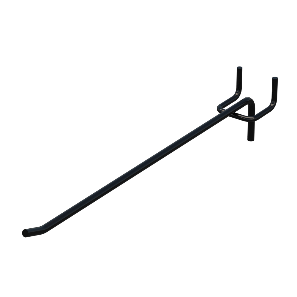 Одинарний гачок довжиною 250 мм призначений для розміщення товарів на торгових стендах з перфорацією. Виріб виконаний із металу з прутом діаметром 4 мм. Покриття кольору Чорний RAL9005 забезпечує захист від корозії. Крок кріплення – 25 мм. Тип виконання - Одинарний. Кріплення - На перфорацію.