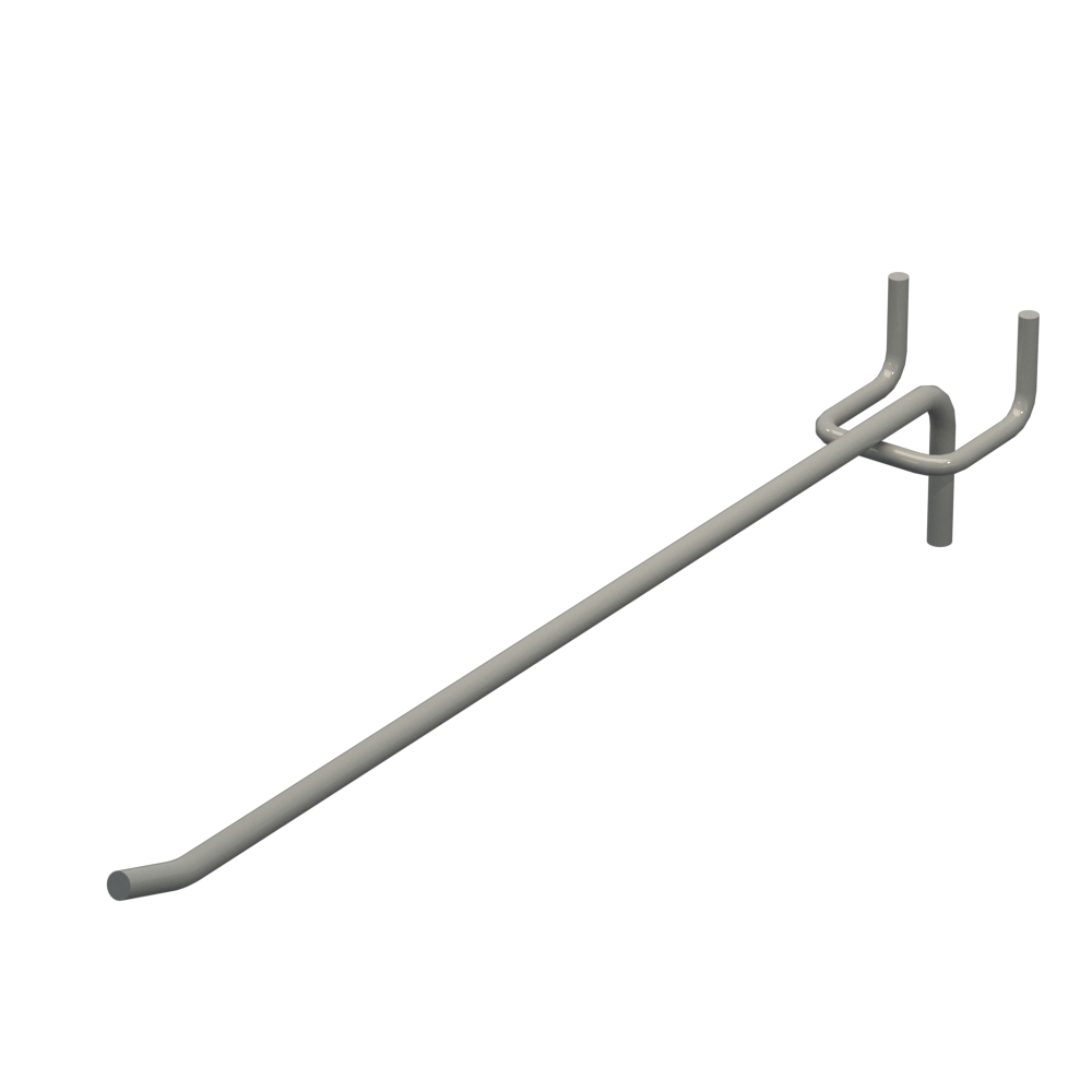 Одинарний торговий гачок із довжиною 250 мм застосовується для викладення продукції на перфорованих панелях. Матеріал виготовлення - сталевий прут діаметром 4 мм. Довжина гачка становить 250 мм. Поверхня пофарбована в колір Сірий RAL9006. Крок перфорації – 50 мм. Гачок відноситься до типу одинарний, кріплення - на перфорацію.