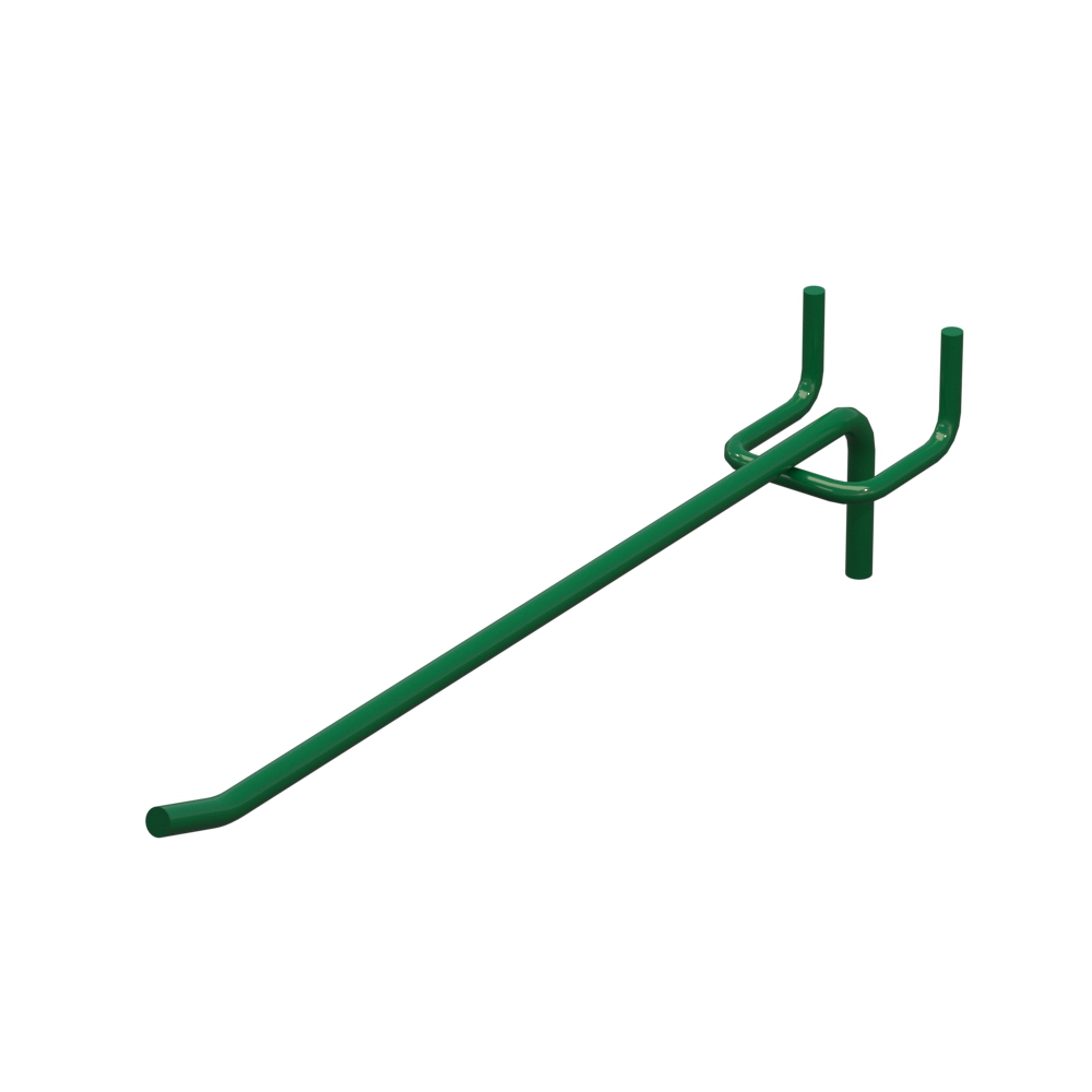Гачок для магазину довжиною 200 мм виготовлений із металевого прута діаметром 5 мм. Виріб виконаний із металу з прутом діаметром 5 мм. Зелений колір RAL6029 забезпечує захист від корозії. Крок кріплення – 25 мм. Тип виконання - Одинарний. Кріплення - На перфорацію.