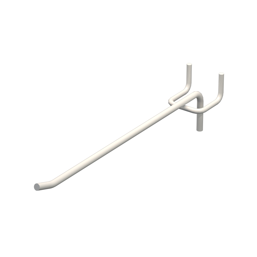 Гачок для магазину довжиною 200 мм виготовлений із металевого прута діаметром 4 мм. Прут діаметром 4 мм забезпечує міцність та надійність. Довжина виробу – 200 мм. Покриття - Білий RAL9003. Гачок призначений для кріплення на перфорації з кроком 35 мм. Тип - одинарний. Спосіб кріплення - На перфорацію.