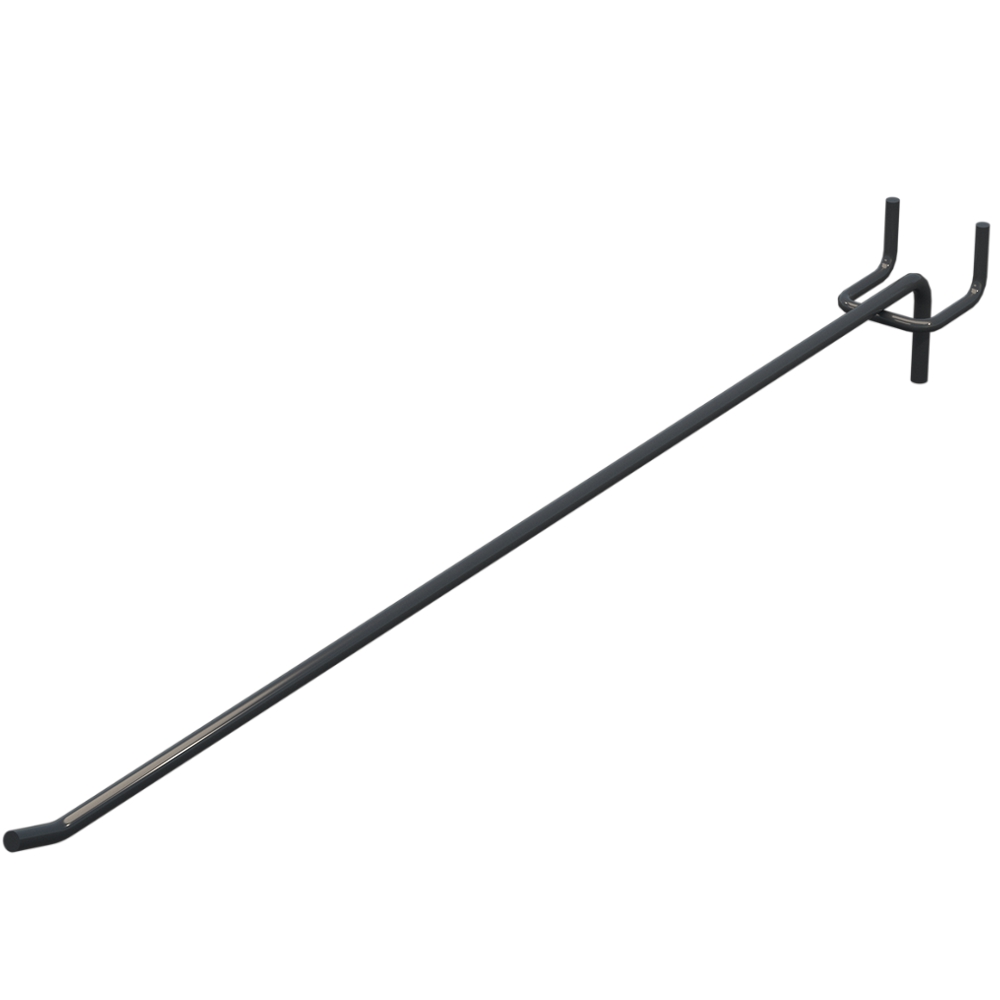 Гачки для перфорації довжиною 400 мм призначені для розміщення товарів на торгових стендах з перфорацією. Виріб виконаний із металу з прутом діаметром 5 мм. Покриття кольору Антрацит RAL7024 забезпечує захист від корозії. Крок кріплення – 50 мм. Тип виконання - Одинарний. Кріплення - На перфорацію.