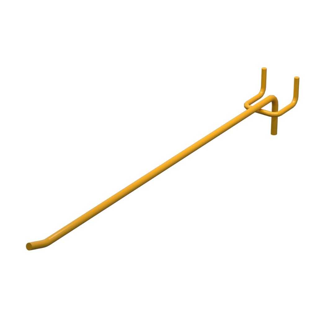 Гачок для магазину довжиною 300 мм виготовлений із металевого прута діаметром 6 мм. Прут діаметром 6 мм забезпечує міцність та надійність. Довжина виробу – 300 мм. Покриття - Жовтий RAL1023. Гачок призначений для кріплення на перфорації з кроком 50 мм. Тип - одинарний. Спосіб кріплення - На перфорацію.