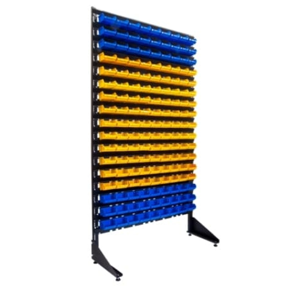 Стелажі для метизів з ящиками — це модульні системи з металевої перфорованої стійки та пластикових лотків LUX. Вони вирішують проблему зберігання болтів М4–М20, гайок, шайб, саморізів, заклепок, дюбелів, запобіжників, хомутів. Наш приставний стелаж на 153 лотки — це компактне рішення для стіни, де сині лотки 703 LUX (54 шт.) маркують "гарячі" позиції, жовті (99 шт.) — резерв. Лотки з ударостійкого поліпропілену, об'єм 0,5 л кожен, навантаження до 5 кг. Загальний об'єм — 76,5 літрів.