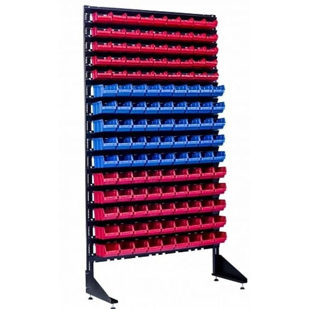 Модель надщільної компоновки: 135 боксів на 0,35 м² — 386 ящ/м². Складські стелажі з ящиками економлять до 84% простору. Стелажі для зберігання дрібних деталей з кольоровими лотками — ідеал для гаражів та складів.