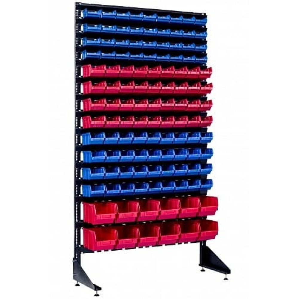 У цій моделі використовується найпопулярніша серед магазинів та складів кріплення система: червоний колір — велике та важке кріплення (болти М8–М20, гайки, анкери, шпильки), синій — дрібне та середнє (саморізи, шурупи, дюбелі, шайби, заклепки, цвяхи). Завдяки цьому стелажі для зберігання болтів, гаек, саморізів та шайб дозволяють комплектувальнику знаходити потрібну позицію за 1–2 секунди.