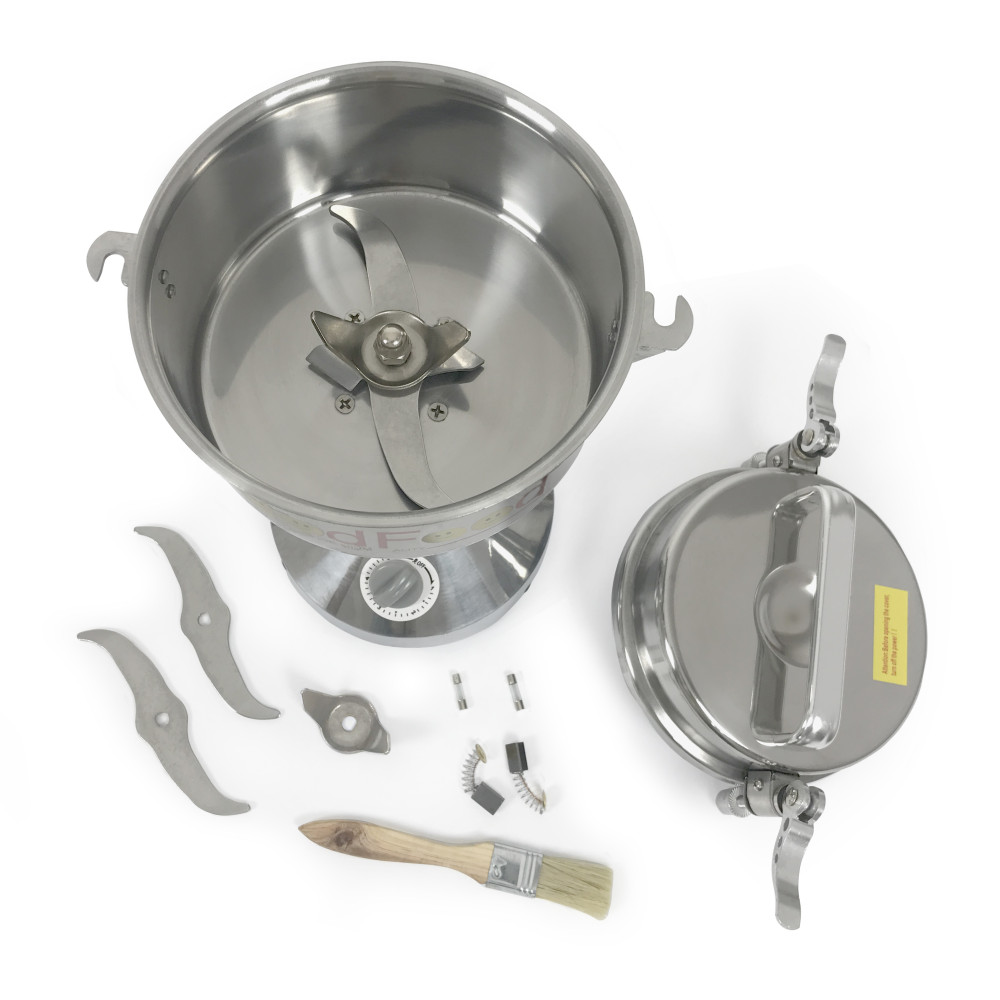 Млин для цукру та спецій комплектується: змінними лопатями ножів, запобіжником, запасними графітовими щітками для електромотора.