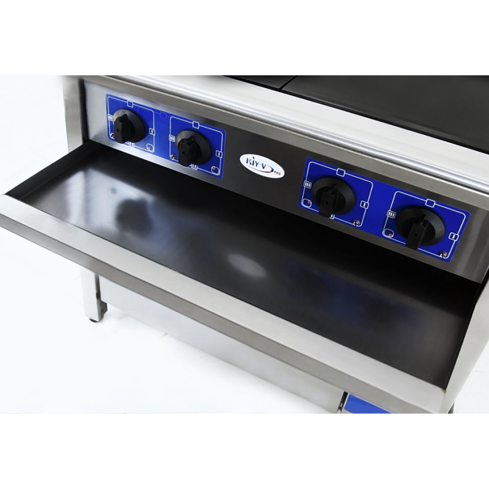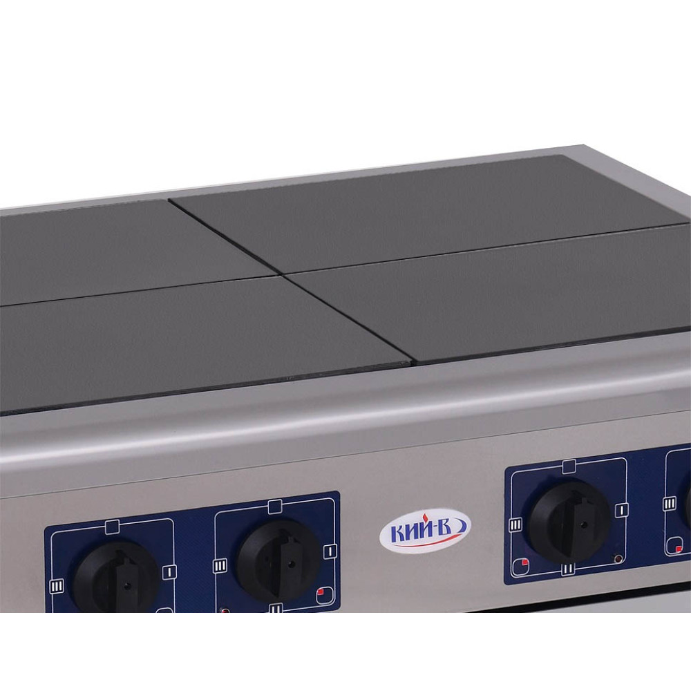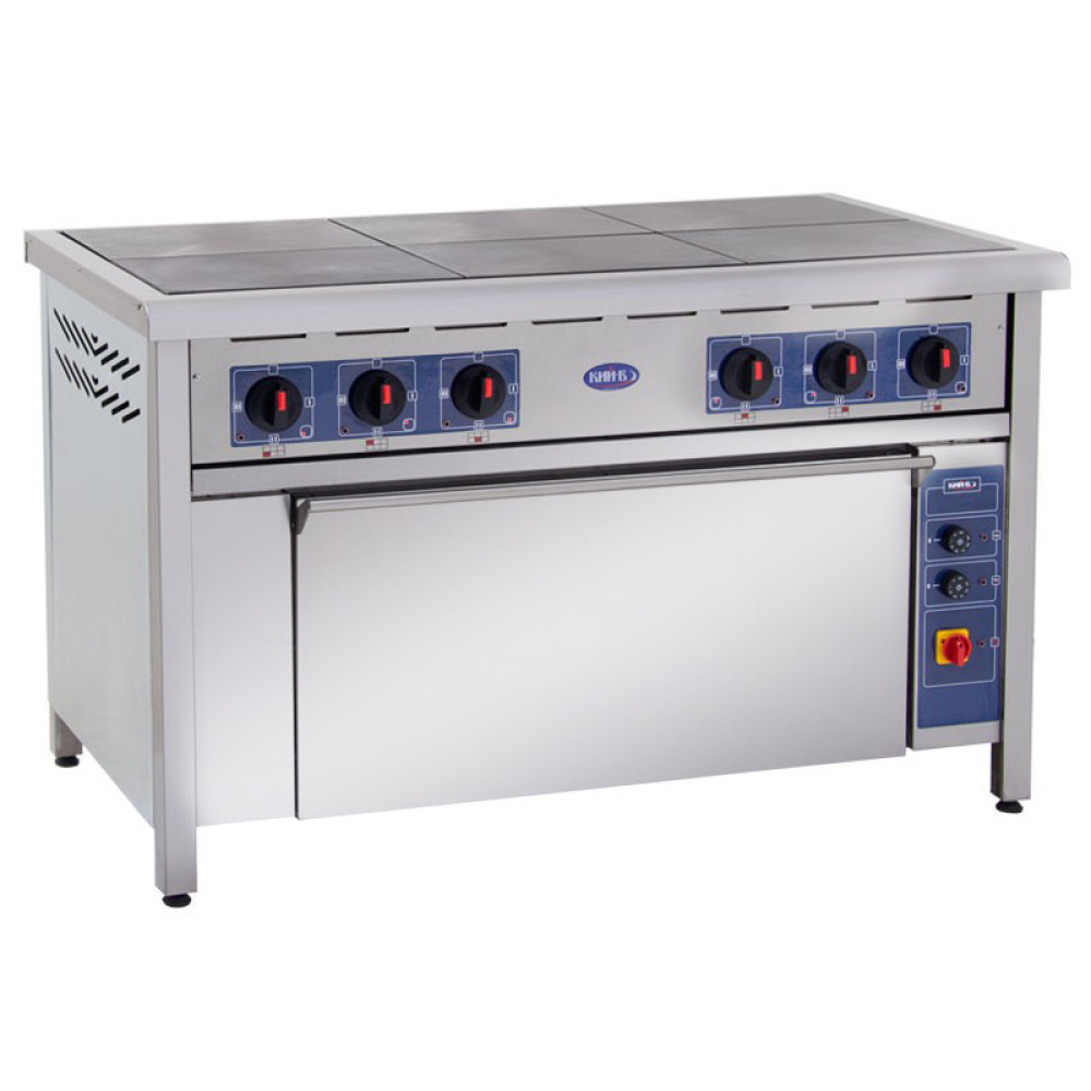 Зручне переміщення посуду будь-яких розмірів по всій поверхні плити. Конфорки виготовлені з чавуну, що забезпечує рівномірний розподіл температури. Стільниця виконана без швів, це полегшує санітарну обробку поверхні. Плита комплектується двома листами із вуглецевого металу. Конструкція духовки забезпечує рівномірне розподілення температури, що гарантує рівномірну випічку. Збільшений розмір шафи для смаження. ТЕНи із нержавіючої сталі значно подовжують термін служби. У духовці передбачено роздільне регулювання верхніх та нижніх ТЕНів. Електрична плита поставляється з кабелем для підключення на 3 фази. До плит пропонуються витяжні парасольки: пристінні та острівні, будь-яких розмірів та конфігурацій. Гарантія 1 рік.
