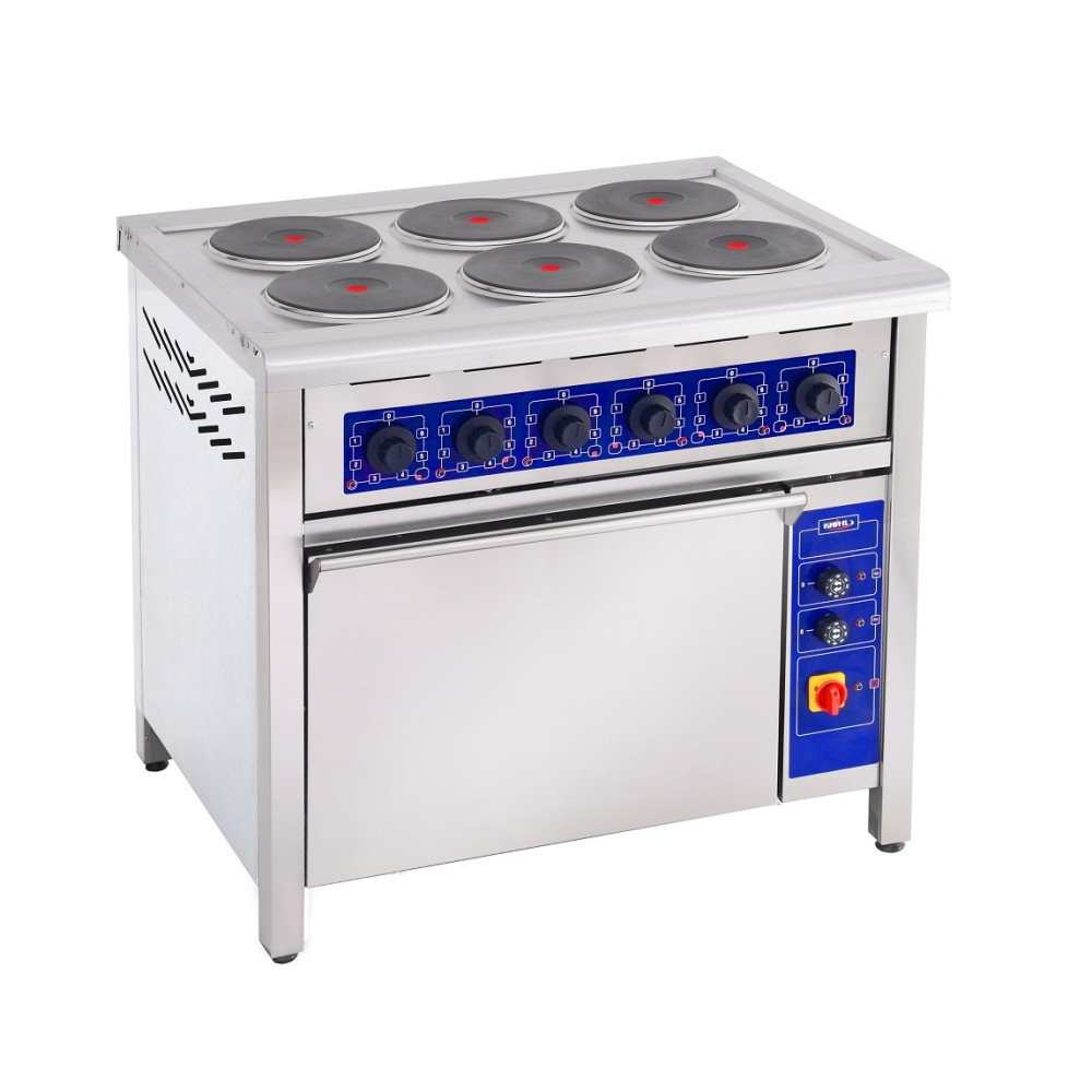 Конфорки виготовлені з чавуну та обладнані захистом від перегріву, що гарантує тривалий термін їх експлуатації. Плита комплектується двома листами із углецевого металу. Конструкція духовки забезпечує рівномірне розподілення температури, що гарантує рівномірну випічку. У духовці передбачено роздільне регулювання верхніх та нижніх ТЕНів. Тіні з нержавіючої сталі значно продовжують термін служби. Плита електрична поставляється з кабелем для підключення на 3 фази. До плит пропонуються витяжні парасольки: пристінні та острівні, будь-яких розмірів та конфігурацій. Гарантія 1 рік