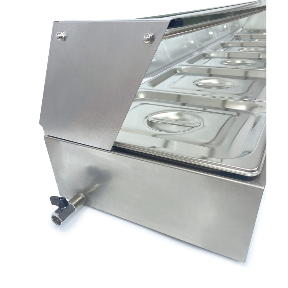 - Настільний марміт-вітрина на 6 гастроємності GN 1/2 х h100 мм дозволяє наочно демонструвати страви, надаючи покупцеві максимальний огляд.